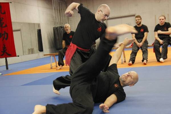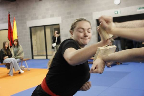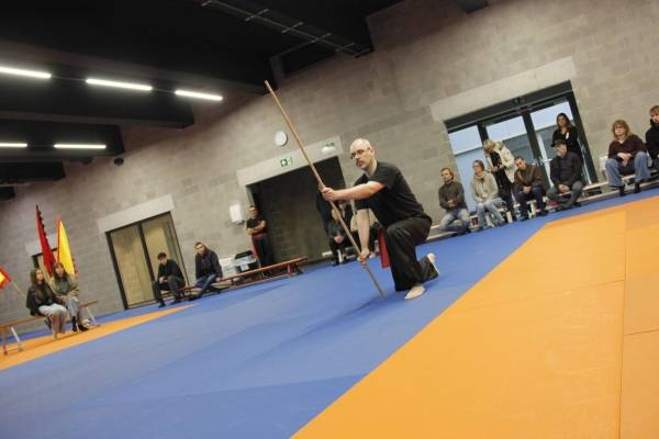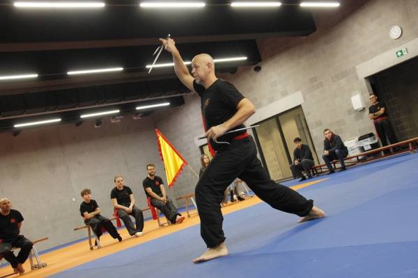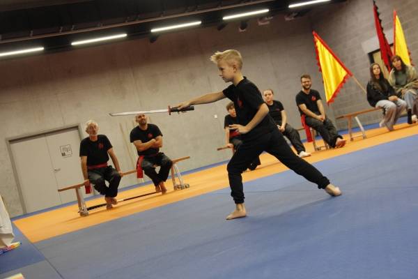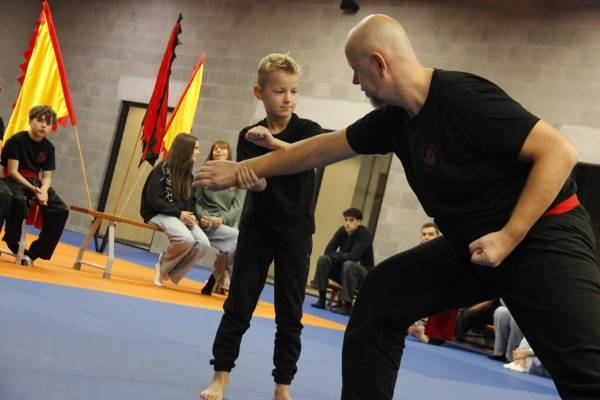 Een bijzondere vermelding verdient Roan van Eijsden. Deze jonge knul is eigenlijk te jong om te mogen deelnemen aan onze trainingen en wedstrijden, maar voor hem maken we graag een uitzondering. Tijdens onze wekelijkse trainingen oefent Roan veelal met zijn vader Jordi en beide heren zijn altijd zeer gedreven en enthousiast. Super leuk om dat zo te zien en te ervaren. Omdat Roan het zo goed doet, mocht hij gisteren ook meedoen aan de Stijlwedstrijd. Hij liep een traditionele handvorm, demonstreerde een bewegingsvorm met zijn eigen zwaard (!) én liet in een mooie zelfverdediging zien dat hij zijn vader aan kan ;-). Super goed gedaan Roan!